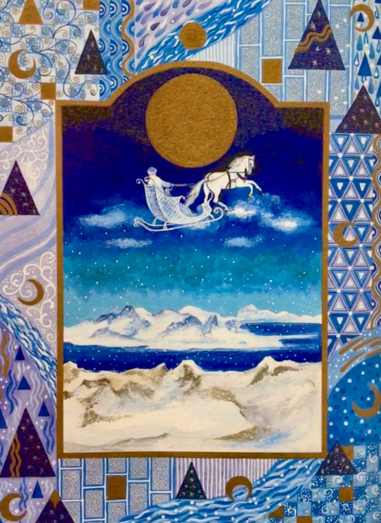 Second image: illustration of the Snow Queen by Isabelle Brent from Fairy Tales of Hans Christian Andersen, translated by Neil Philip.